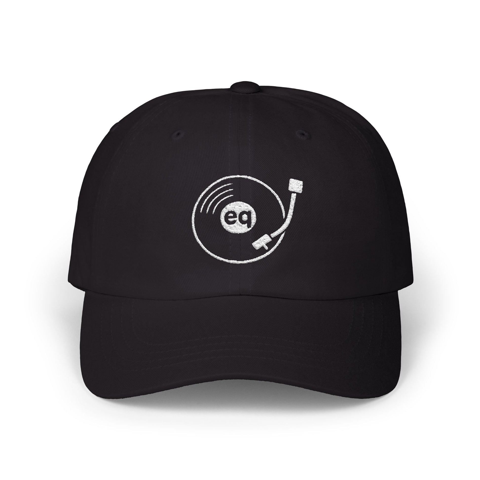 A classic black dad cap with an embroidered record and needle design. Soft, breathable, and built for everyday wear with a vintage-style buckle and low-key fit.